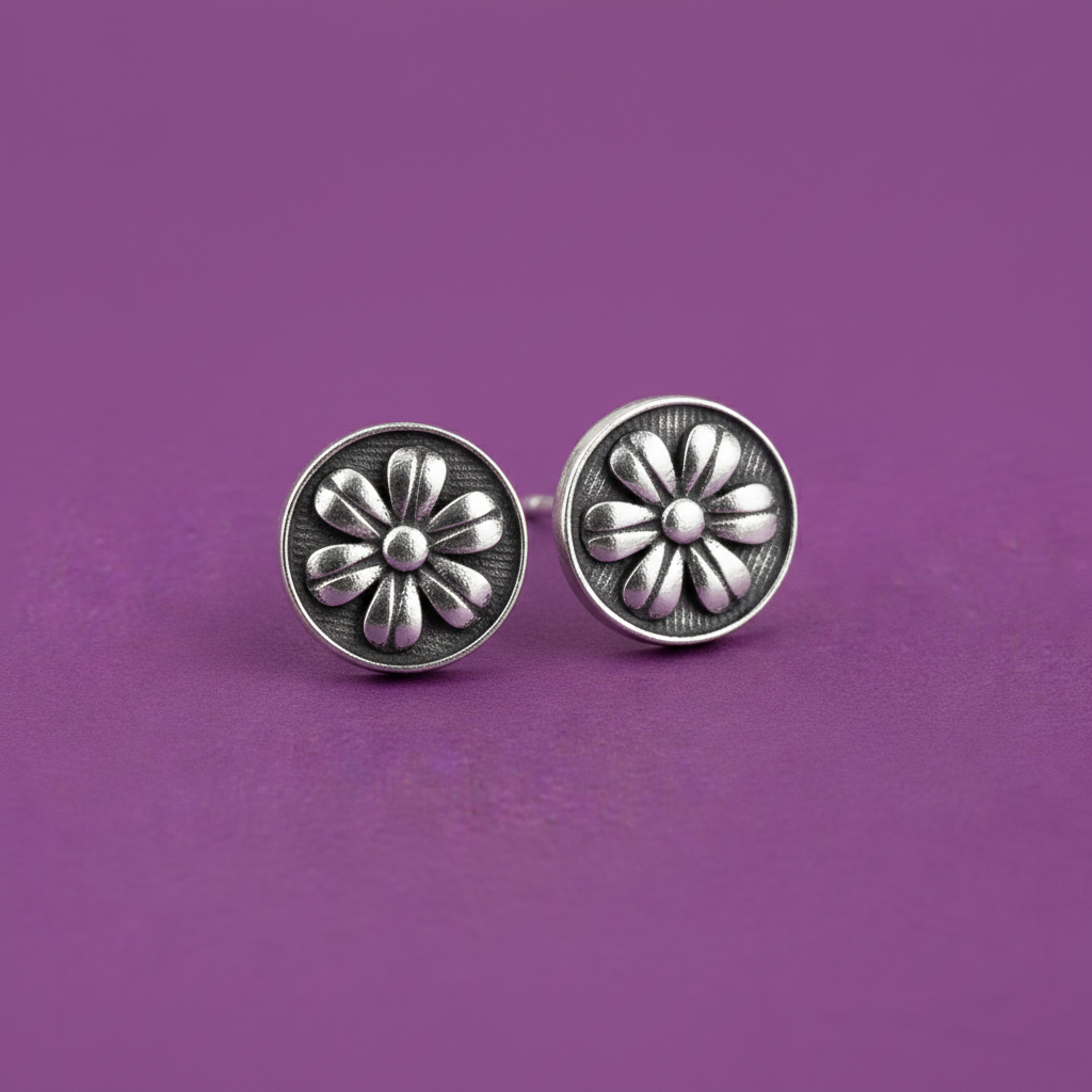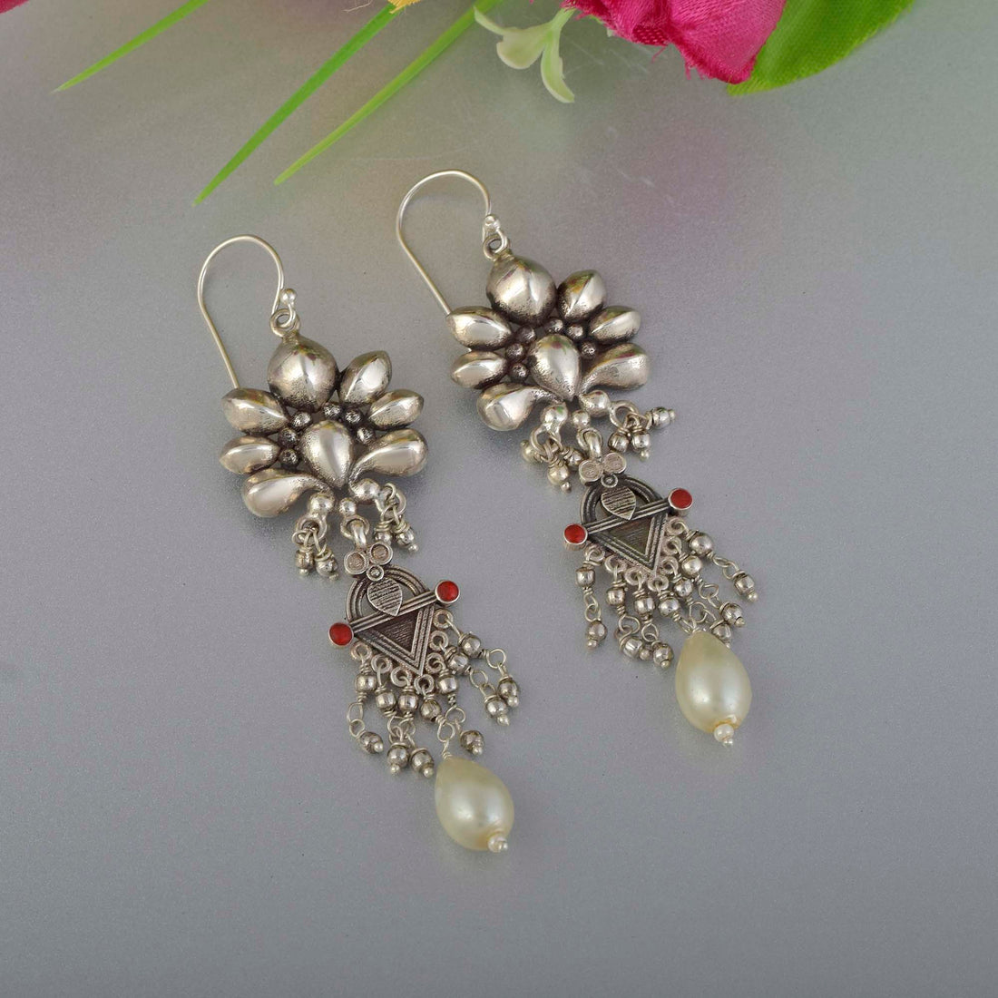 These oxidized floral motif pearl earrings blend vintage-inspired craftsmanship with contemporary design sensibilities. The darkened...